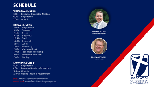 *Children's Programming is available during all three sessions. Children will also be dismissed during Worship Service before sermon.
